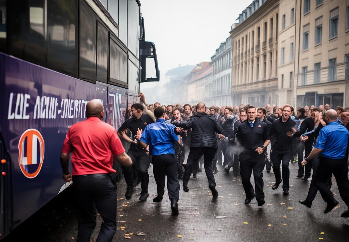 4. 安保人员紧急介入:面对这突如其来的暴力袭击,现场安保人员迅速反应,试图将极端球迷与球员、工作人员隔离。他们用身体组成人墙,保护大巴车不受进一步的攻击。然而,在人数众多的极端球迷面前,安保人员显得力不从心。